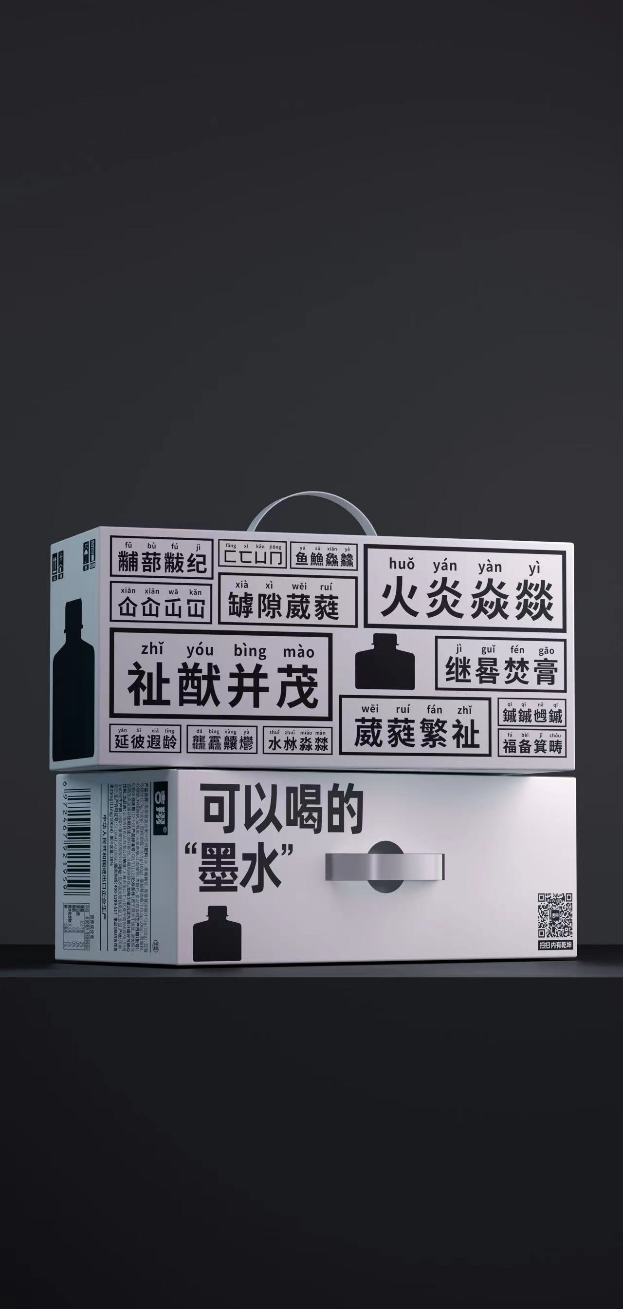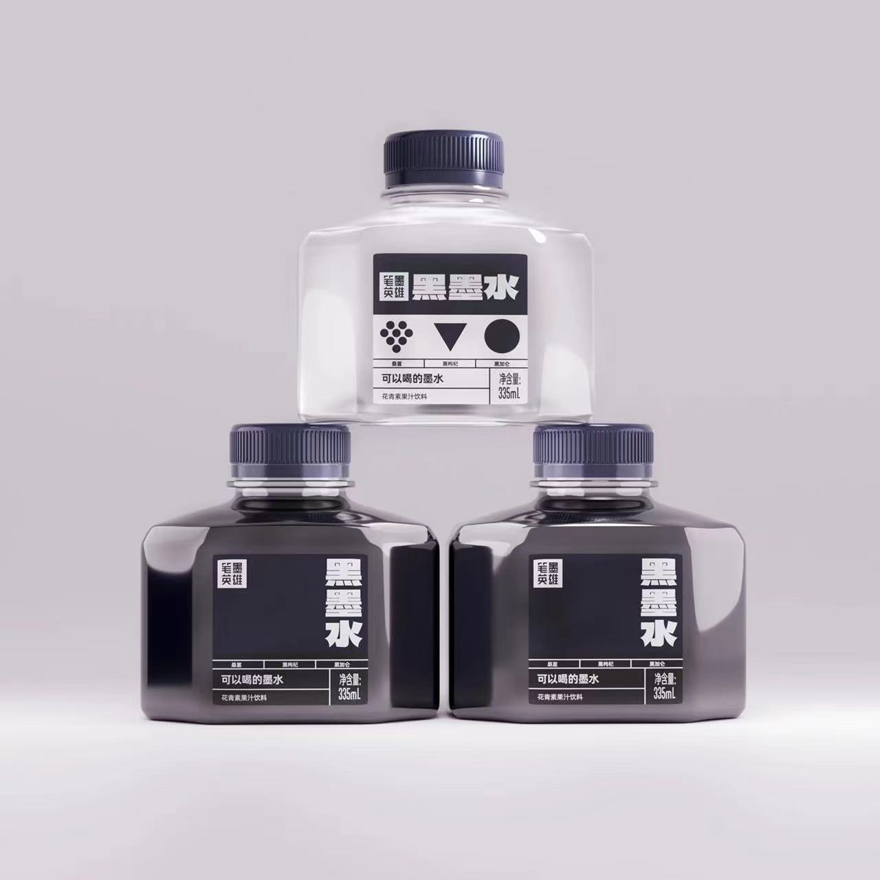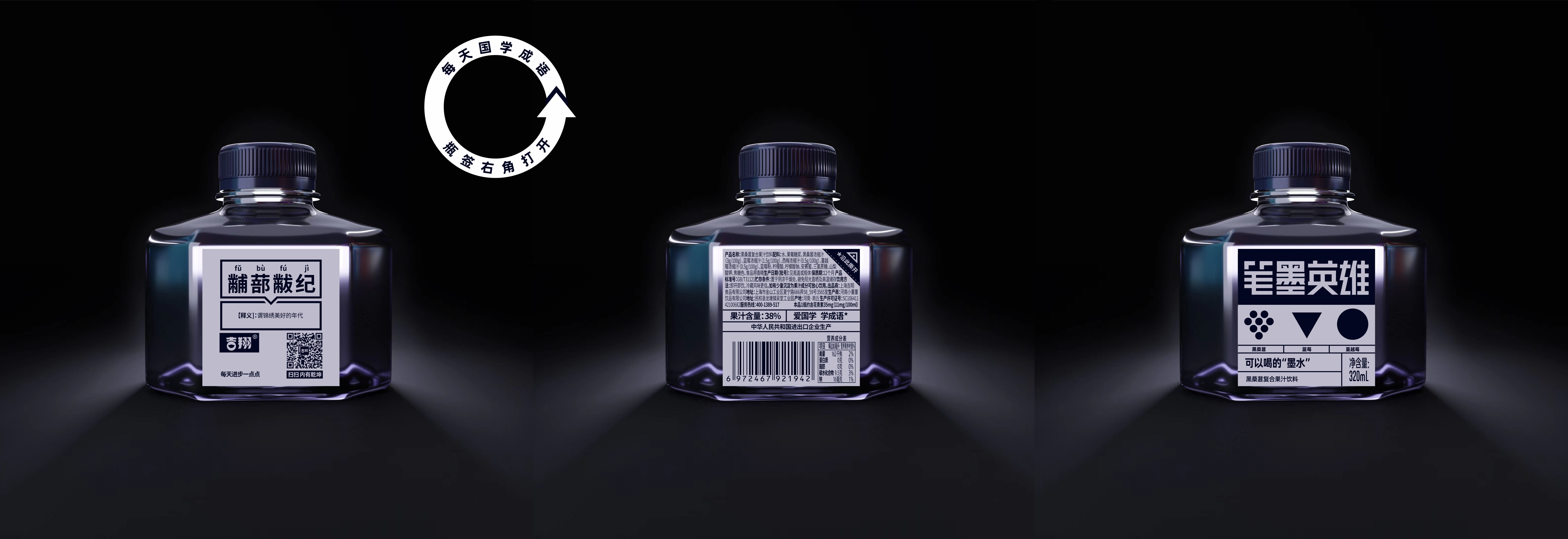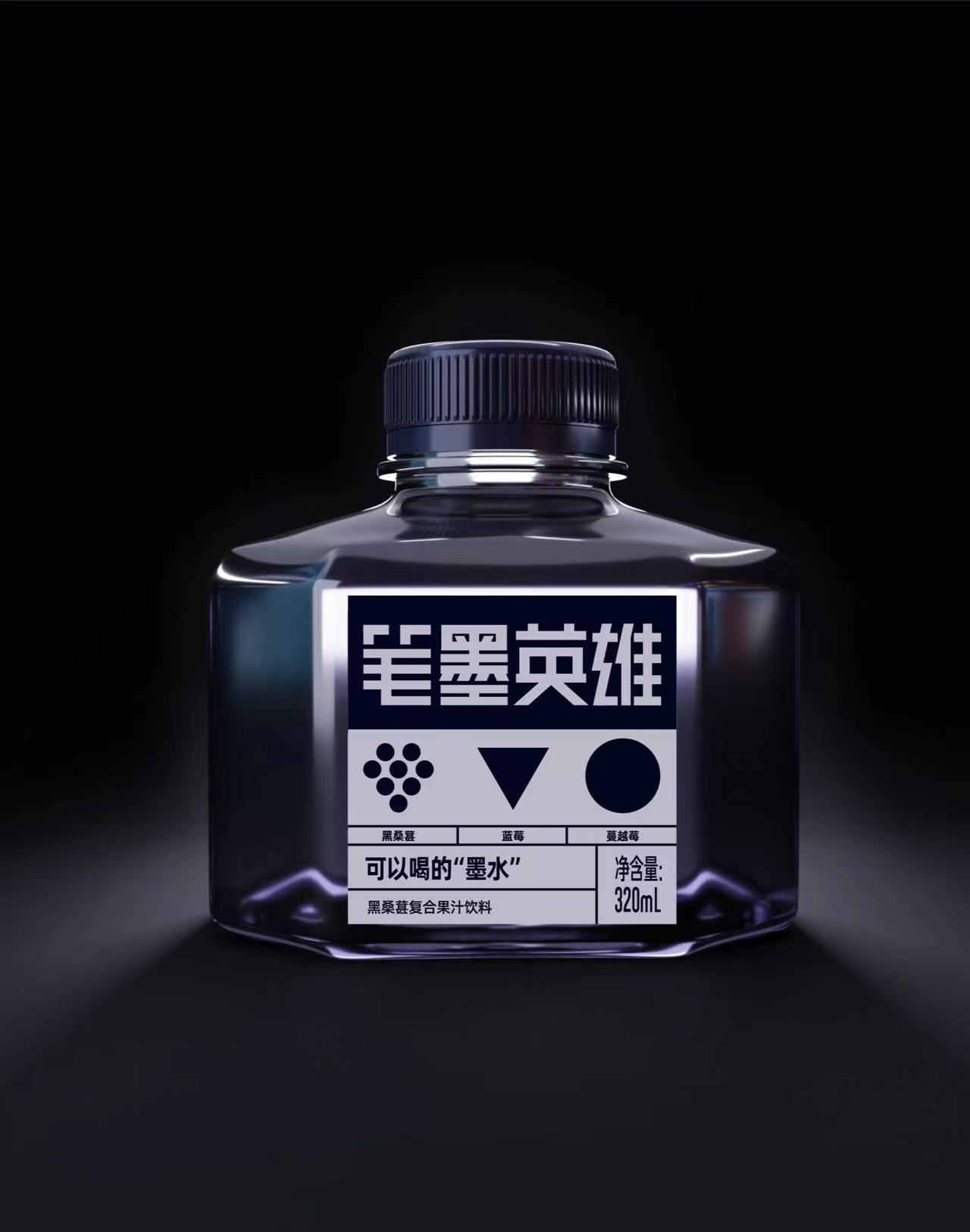 笔墨英雄的创意,源自2019年锐澳与英雄牌墨水的联盟款。客户选用黑加仑、黑枸杞、黑桑葚等黑色果汁原料,呈现出自来熟的文化属性。背签设计两层,撕开后可以看到独特的中国生僻字,让用户在消费产品时,边喝边学习知识。笔墨英雄商标名字,更是起了不下于7000多个。产品的瓶型呈现上,更是精心打磨了3年。未来笔墨英雄会推出三个口味:黑墨水、红墨水、蓝墨水,分布为三款不同的花青素复合果汁。好产品无需多言,一眼入魂,瞬间吸引。